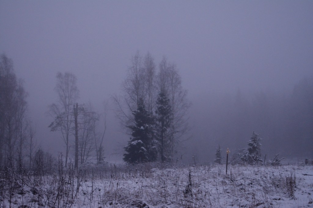 När jag kröp ner i sovsäcken så hade snöfallet börjat igen. Jag hörde en räv ropa till några gånger, bilar som brummade långt borta och snart sov jag gott. Jag vaknade tidigt, vid 5-tiden, av ljudet från någon som sågade med motorsåg en bit bort. Inte så mysigt ljud att vakna till. Jag föredrar naturens egna ljud. Jag somnade dock om efter en stund, när fridstöraren sågat klart, och jag vaknade igen vid halv sju. Det tar alltid emot att lämna den varma sovsäcken så här i vintertid. Det blir lite kallt att komma ut i sovunderstället och byta om. Man får snabbt ut och röra sig så att man får upp värmen. Snart hade jag kommit igång och satte fart på brasan igen. När det ljusnade såg jag det underbara snötäcket. Tänk om det kunde hålla sig på minussidan så att den vackra vita snön fick ligga kvar.
