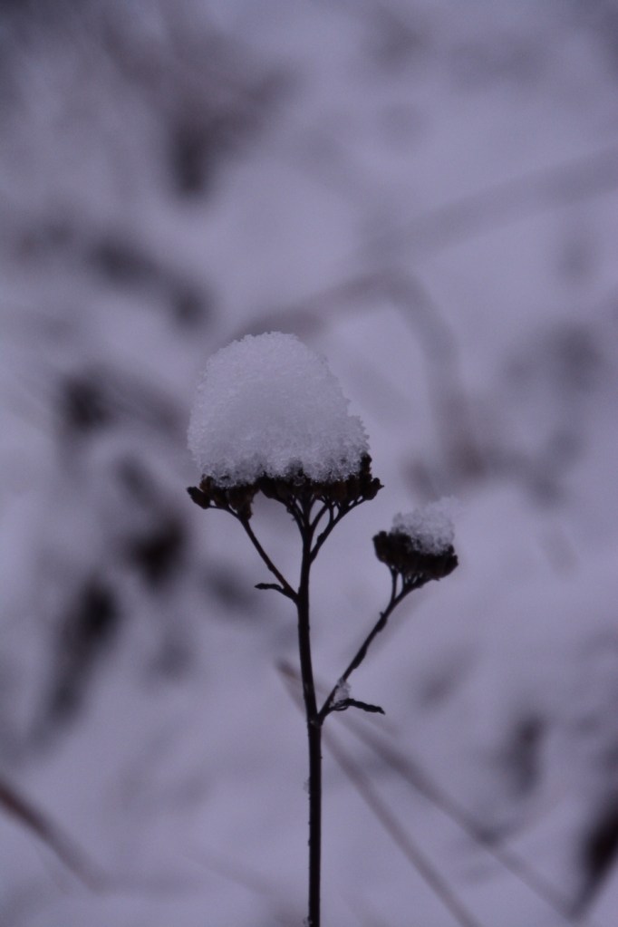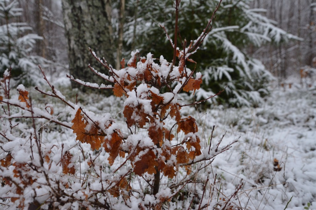 Efter frukosten gick jag en tur i omgivningarna för att föreviga den här vackra sista dagen på året 2020. Den fluffiga snön låg så fint på både träd och växter. De små ekarna i skogen hade löven kvar och de blev en härlig kontrast mot den vita snön.