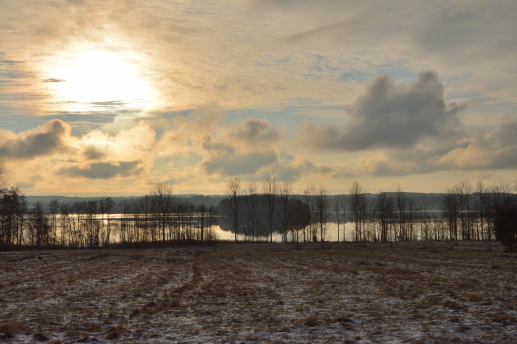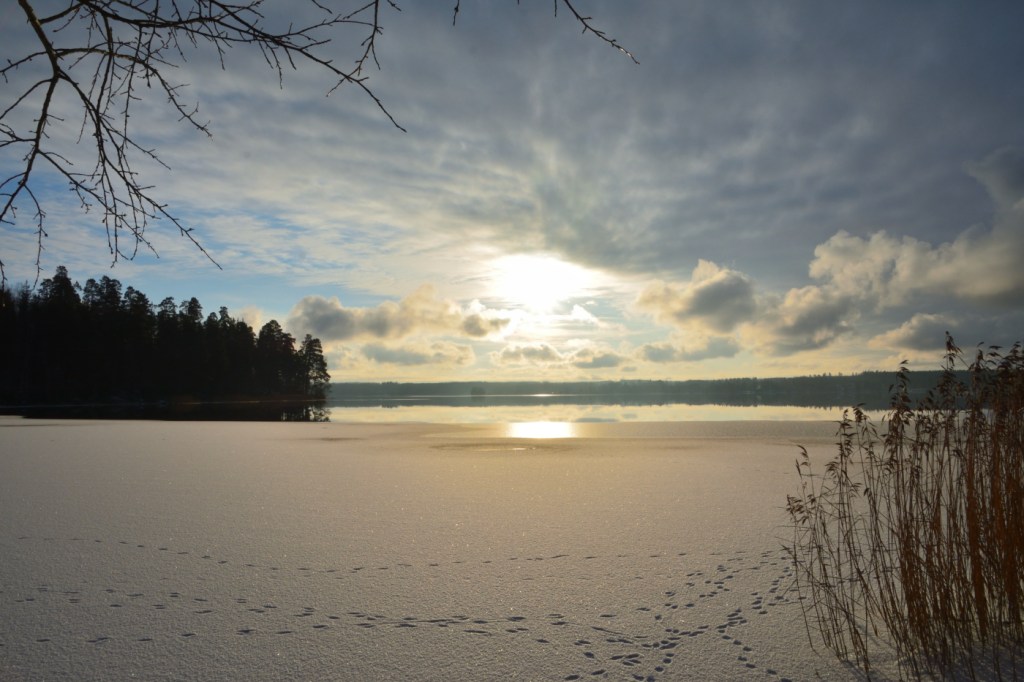 Det var ett par minusgrader och solens strålar gnistrade i det lilla snötäcket på ängen. Det var fantastiskt att gå ner mot vattnet och njuta av denna dags stillhet och skönhet.