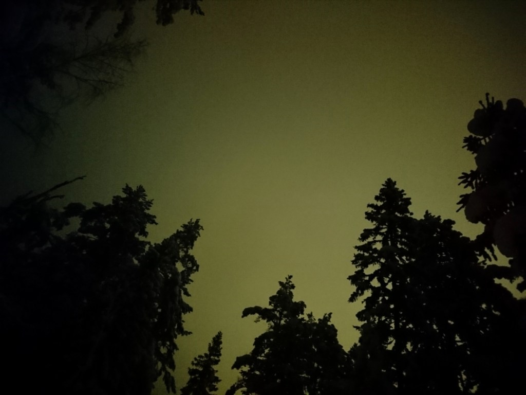 ”Den blå timmen” är så vacker på vintern när snön täcker skogen och träden. När det mörknade än mer, så byttes den blå färgen ut och ersattes av ett grönaktigt sken från stadens ljus. (bilden nedan) Det var riktigt fint och stämningsfullt.