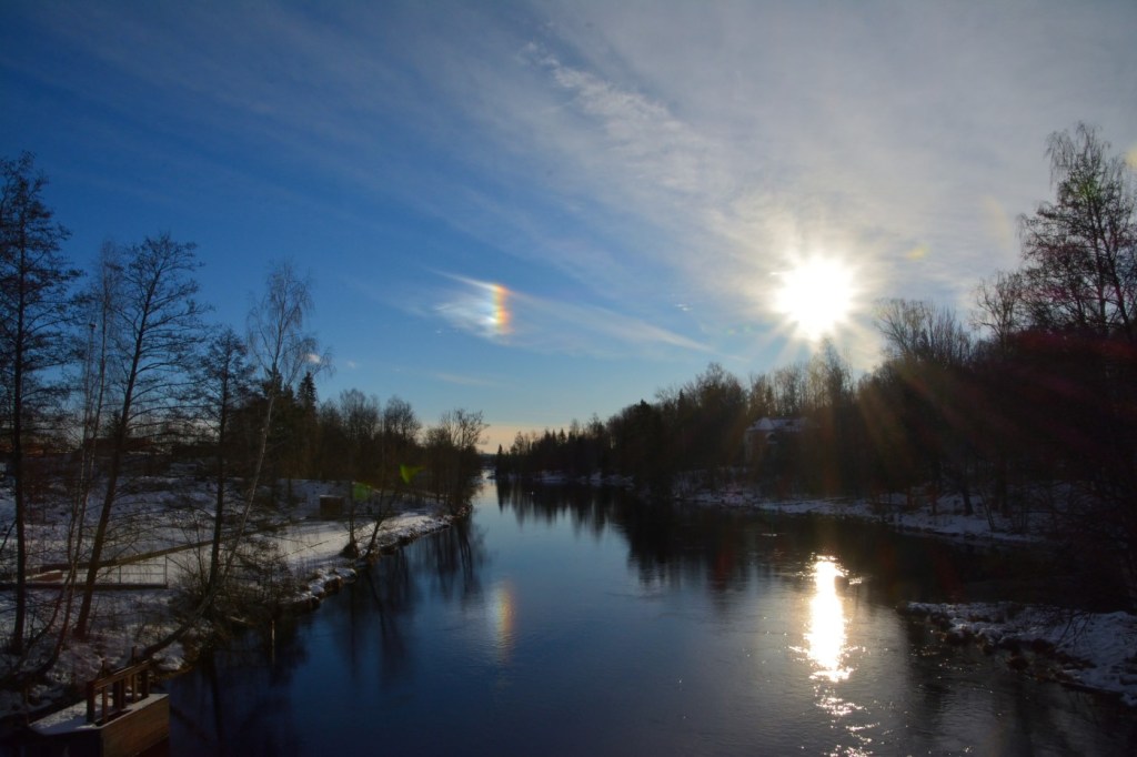 Detta är ett ljusbrytnings-fenomen som kallas för solhund och det uppstår när solljuset passerar genom plattformade iskristaller på hög höjd. Här nedan ser du en närmare bild på detta regnbågs-skimrande moln. Visst var det vackert!? 🙂