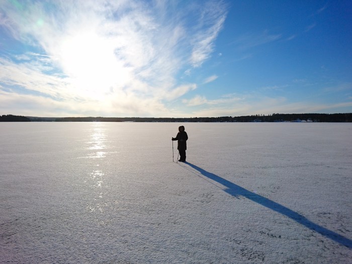 Inspirerade av den fina onsdagsturen och den hållbara isen, så tog vi ännu en ispromenad idag. Det var lite soldis och lätta moln omkring solen, men vi gick flera kilometer längs kanten av sjön.