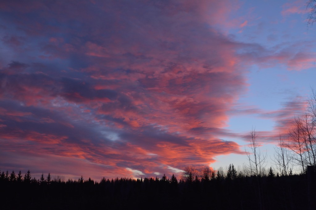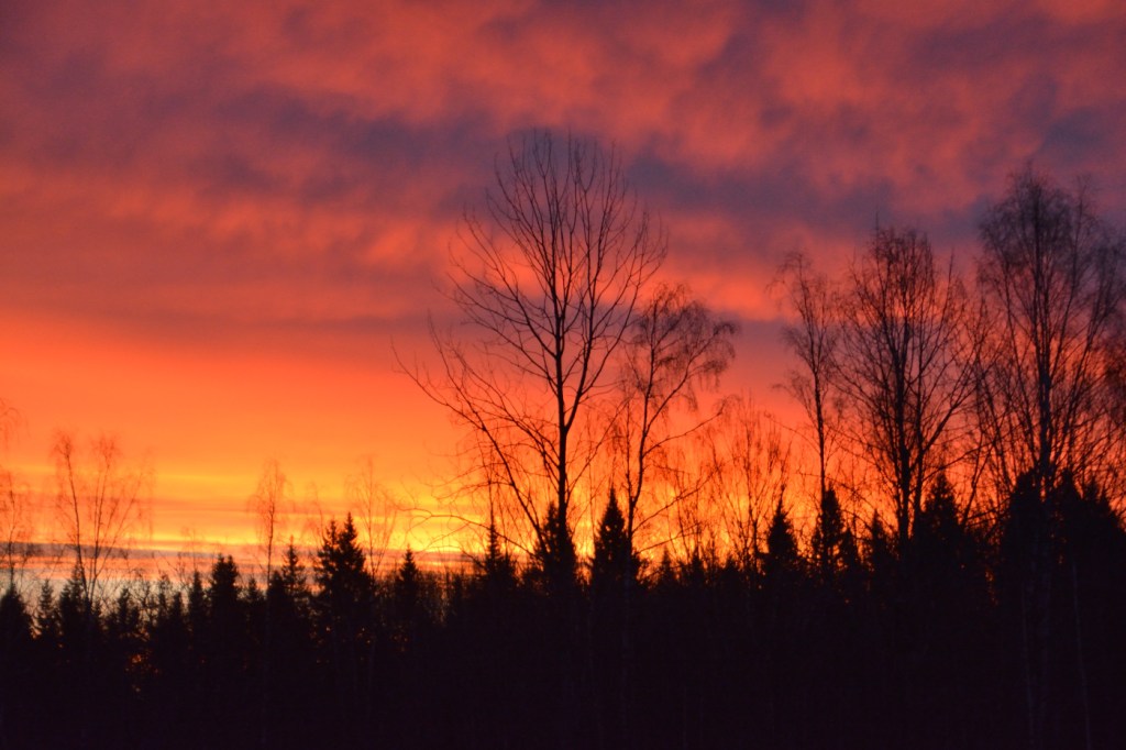 Sent på kvällen hörde jag en kattuggla hoa. En hare skrek sitt gälla och lite dramatiska skrik och en räv skällde till. Det var spännande att sitta och lyssna till naturens alla ljud, ackompanjerade av den knastrande elden. Kattugglan hoade långt borta även när jag lagt mig i sovsäcken. Det är ett så härligt och magiskt nattljud. Jag somnade snart, sov gott och vaknade i gryningen av att koltrasten började sjunga igen. Det hade börjat ljusna lite vid horisonten, men jag låg kvar en stund och njöt av koltrastens serenader. Efter en stund fylldes himlen av så vackra färger så jag lämnade sovsäcksvärmen för att gå upp och föreviga denna vackra soluppgång.