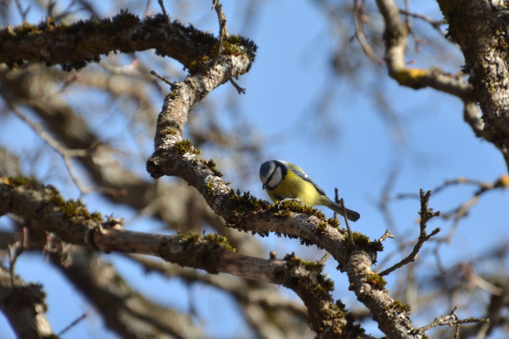 En liten blåmes sökte av några mossiga trädgrenar. Den var nog på jakt efter små insekter.
