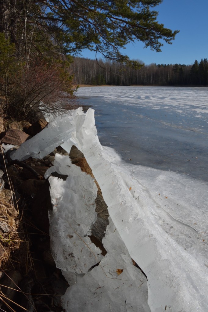 På vissa ställen har isen också börjat röra sig och tryckts upp mot strandkanten, som i bilden här nedanför. Detta beror delvis på att vattnen-nivån har sjunkit, men även på isens rörelser så här i vårtid.