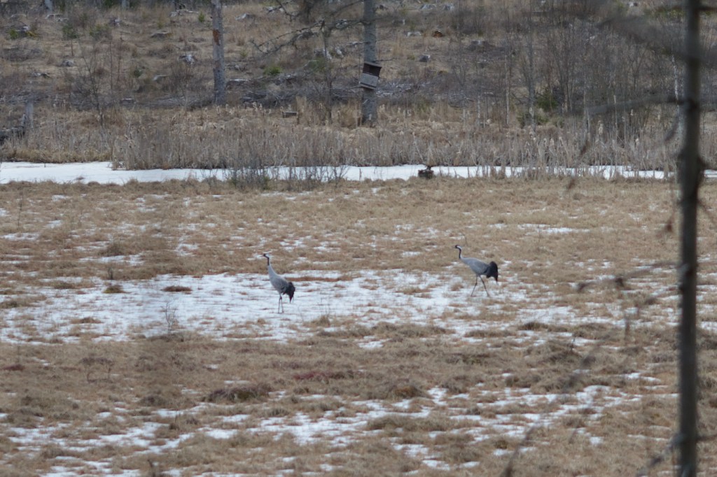 Vid mossen som ligger nära Flobostigen så stod det ett tranpar härom kvällen. De ropade ibland så det ekade över hela skogen. Det var fortfarande lite is och snö kvar på mossen, så det kan inte vara helt lätt för tranorna att hitta föda.