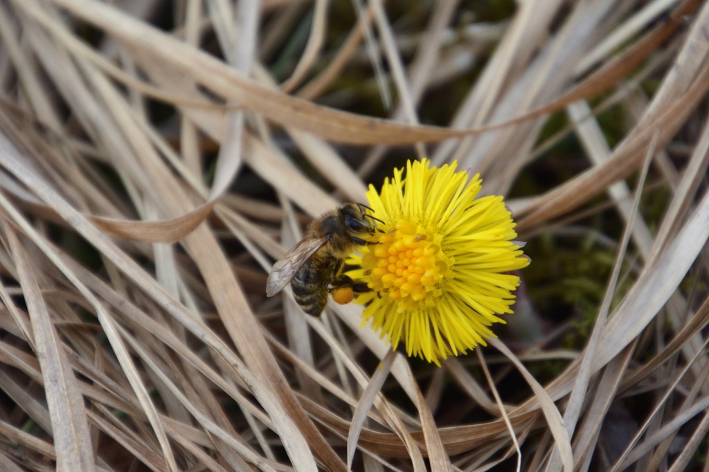 När jag gick längs Flobostigen såg jag ett honungsbi som surrade mellan tussilagona. Troligen är det ett av Hasses bin från kuporna i Ulvsbo, som ligger ett par kilometer bort. Så roligt att se att de är aktiva så här tidigt på vårkanten. 🙂